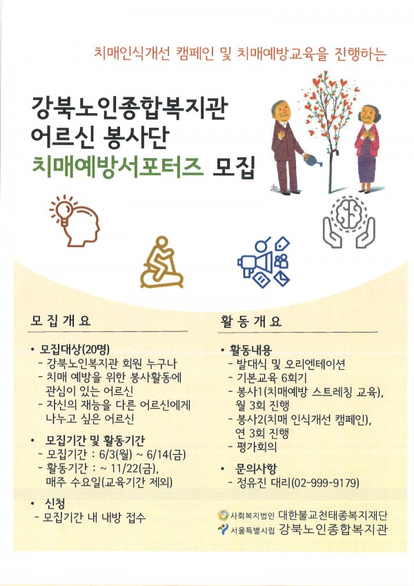강북노인종합복지관에서는 치매예방 및 치매인식개선을 위한 치매예방서포터즈 자원봉사자를 모집하고자 합니다.