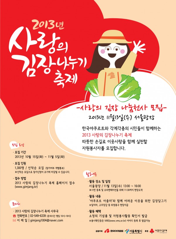 1. '2013 사랑의 김장나누기 축제’는 서울특별시 및 한국야쿠르트가 공동주최하고 서울시복지재단이 지원하여 한국야쿠르트 직원 및 자원봉사자가 정성으로 만든 김장 김치를 서울시에 거주하는 소외계층에게 전달하는 김장 나눔 축제입니다.