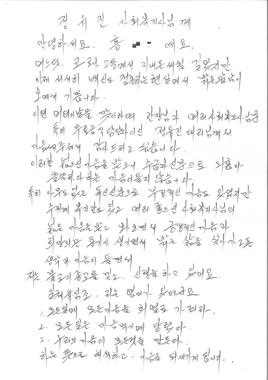 따뜻한 편지를 보내주신 어르신의 마음에 벅찬 감동이였습니다. 이 자리를 빌어 감사 인사드립니다.