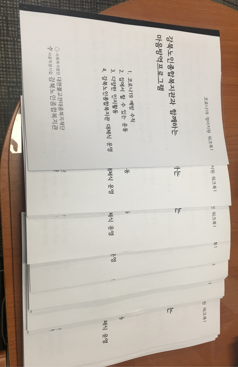 워크북은 코로나19 예방수칙, 집에서 할 수 있는 다양한 운동방법 소개, 다양한 인지활동, 강북노인종합복지관 소식 등의 내용으로 구성되어있습니다.