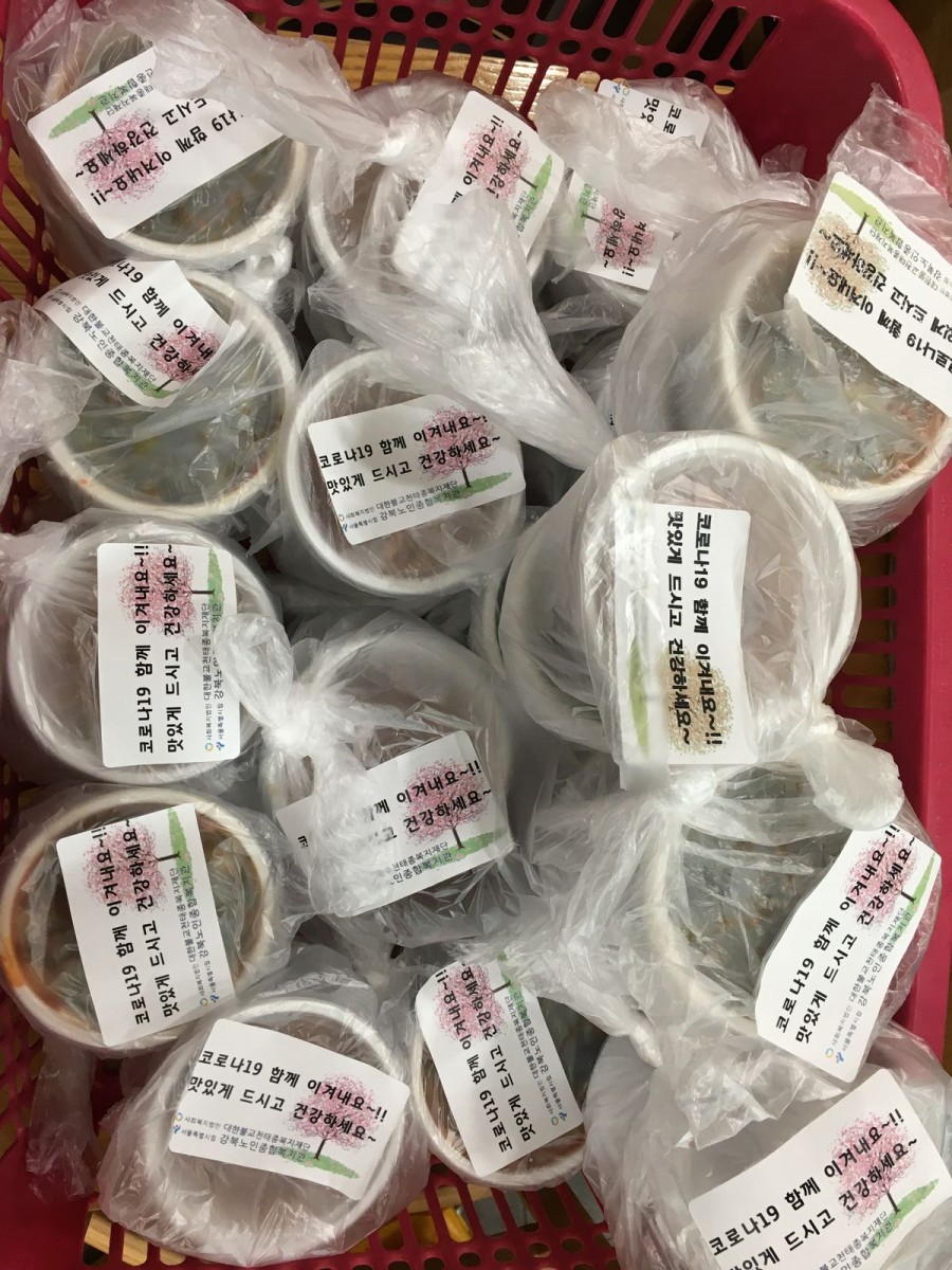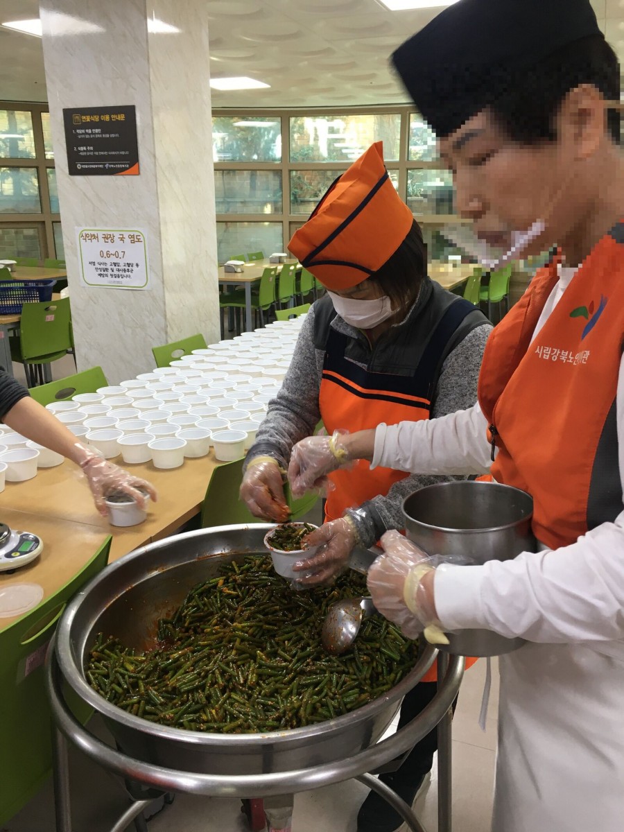 복지관 직원들이 함께 모여 어르신들의 건강한 식사를 위해 밑반찬을 포장하고 배분하였습니다.