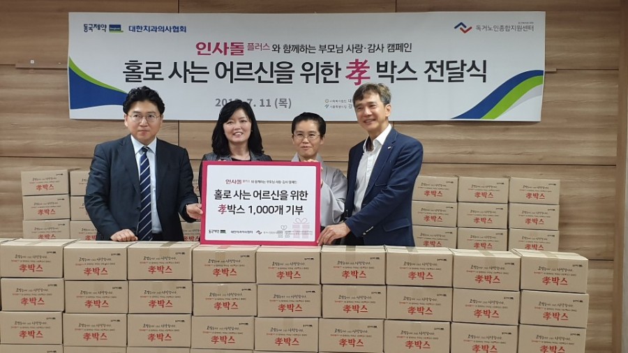 노인돌봄기본서비스사업에서는 동국제약과 함께하는 홀로 사는 어르신을 위한 孝효박스 지원사업 전달식을 진행하였습니다. ▣ 진행일시 : 2019.07.11(목), 15:00~16:00▣ 진행장소 : 지하1층 연꽃식당 ▣ 진행내용 : 동국제약과 함께하는 홀로 사는 어르신을 위한 孝효박스 전달식