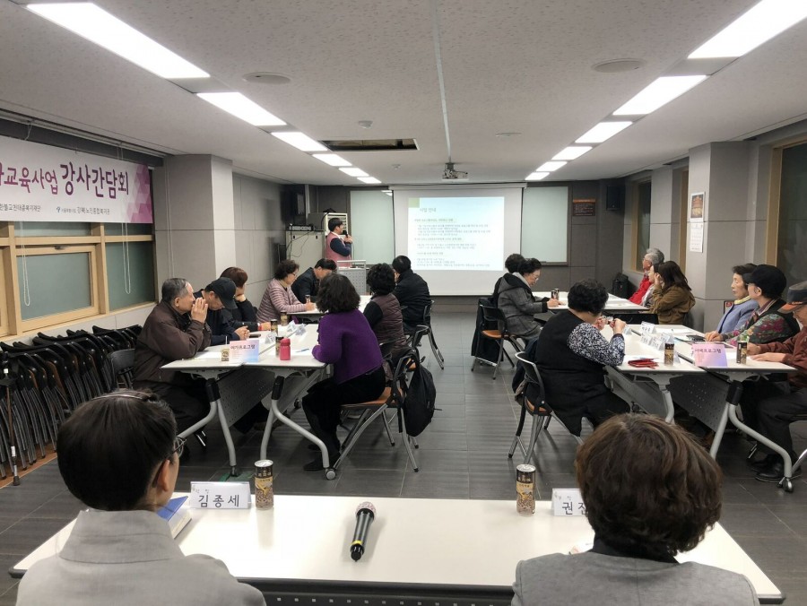 본 복지관 노년사회화교육 사업에서는 노년사회화교육 강사들을 대상으로 2018년 하반기 노년사회화교육사업 강사간담회를 진행하였습니다. 강사간담회를 통해 강사 상호 간의 결속력 강화와 직원들과의 소통을 통해 복지관 노년사회화교육 수업의 질을 향상하고 새로운 열정을 가지고 수업을 진행하도록 격려하는 시간이 되었습니다.
