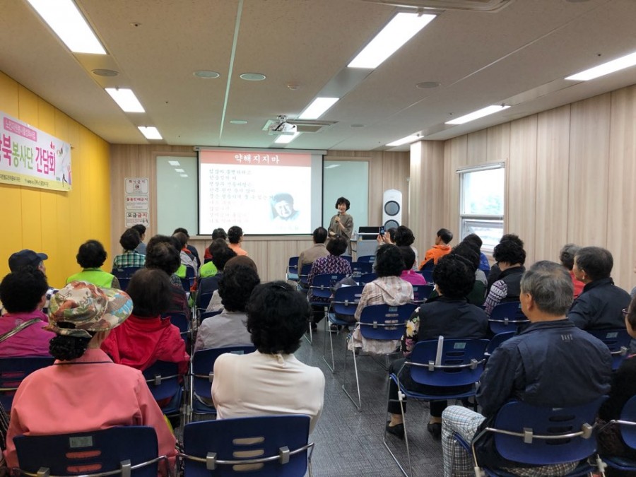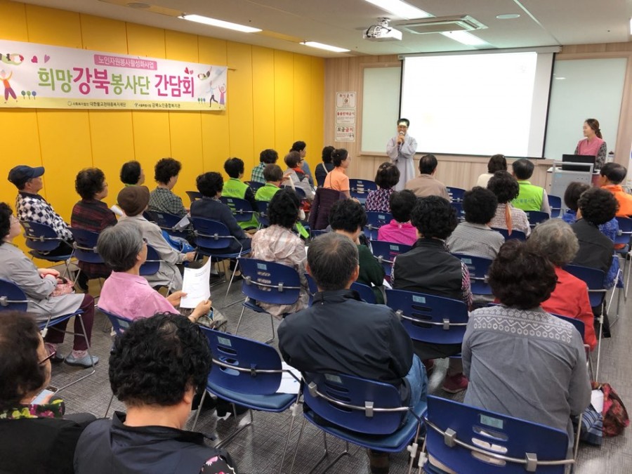 노인자원봉사활성화사업에서는 희망강북봉사단 단원과의 소통의 장 마련 및 토의를 통해 봉사활동의 질적향상을 도모하고자 상반기 간담회 및 자원봉사자의 역량을 강화하고자 노인인권 및 학대예방교육을 실시하였습니다. 상반기 간담회에서는 봉사단의 발전방향 등에 대한 토의가 이루어졌습니다. 총 50명의 단원이 참석하였으며 자원봉사자들의 생각과 의견을 공유할 수 있는 시간이 되었습니다.