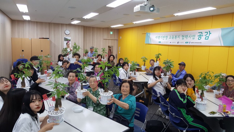 지역협력팀에서는 어르신과 중학생을 대상으로 지역기반형 교육복지 협력사업 '공감' 2회기를 진행하였습니다. 2회기 활동은 원예활동으로 파키라 식물심기를 하였습니다. 1.3세대가 어우러져서 함께하는 모습이 정말 보기 좋았습니다.