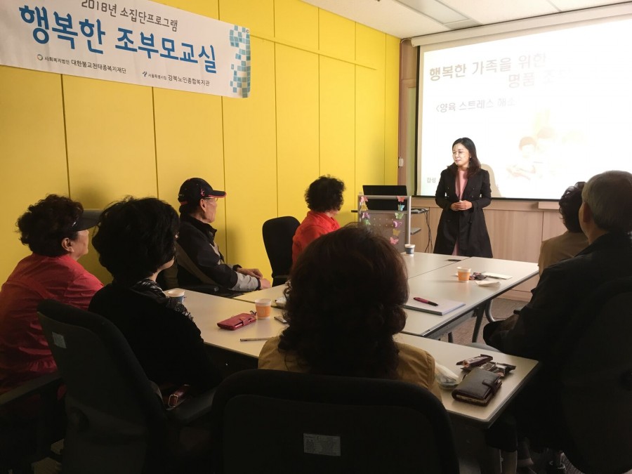 사회참여팀에서는 손자녀를 양육거나 돌보는 어르신들을 대상으로「손자녀를 둔 조부모들의 모임」프로그램을 진행하였습니다. 이번 교육에서는 '양육스트레스 해소'를 주제로 진행하였습니다.