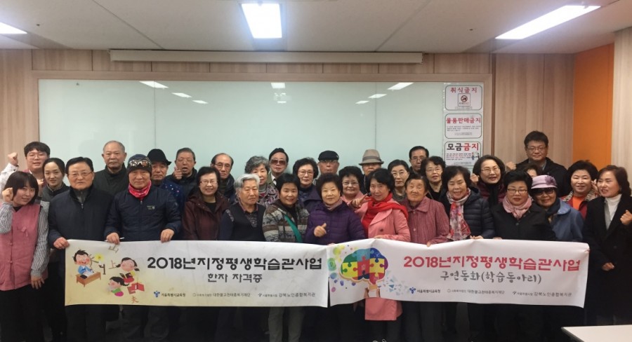 본 복지관 평생교육사업에서는 서울특별시교육청에서 지원을 받아 2018년 지정평생학습관사업(한자자격증, 구연동화 학습동아리) 개강식을 진행하였습니다. 개강식을 통해 어르신들에게 지정평생학습관사업에 대해 안내하고 궁금 사항을 함께 나눔으로써 사업에 대한 이해도를 높이고 활동을 지속할 수 있는 의지를 제공하였습니다.