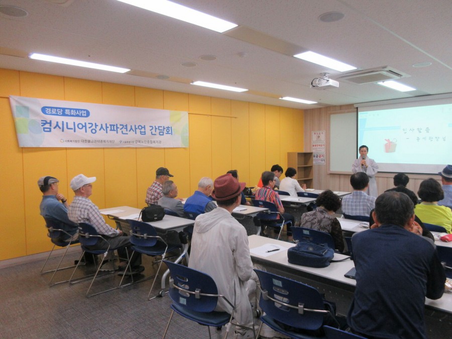 복지사업과에서는 컴시니어강사를 대상으로 컴시니어강사파견사업의 발전적인 사업방향에 대한 의견교환 및 상반기 사업 점검 및 하반기 추진계획을 안내하고자 간담회를 진행하였습니다. 간담회에 참여해주신 강사님들 감사합니다.▣ 일 시 : 2017년 5월 30일(화), 15:00~16:00