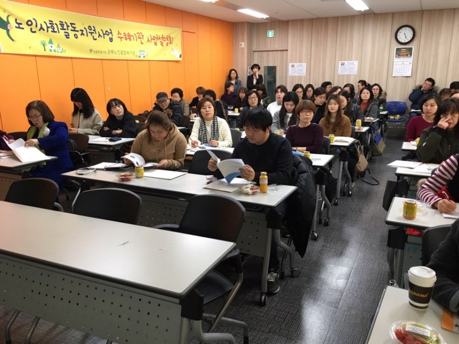 복지행정과 노인사회활동지원사업에서는 지난 3월 9일(목) 2017년 노인사회활동지원사업 연계기관 담당자를 대상으로 2017년 노인사회활동지원사업의 방향성에 대해 안내하기 위해 "2017년 노인사회활동지원사업 수혜기관사업설명회"를 진행하였습니다. 이번 수혜기관 사업설명회에서는 관장님 인사말 및 담당 직원 인사, 2017년 주요 변경사항, 공지사항, 질의응답 순으로 진행하였습니다.