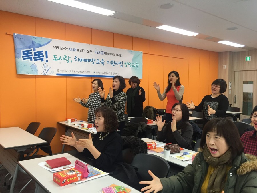 사례개발사업에서는 '똑똑! 도시락, 치매예방교육 지원사업'에 참여하는 생활관리사 10명을 대상으로 치매서포터즈 양성과 역량강화를 위하여 5차 양성교육을 실시하였습니다. 금일에는 두뇌체조(아리랑, 묵찌빠), 창의교구(하트), 보드(할리갈리), 두뇌퍼즐(초성으로 직업 맞추기, 방향 인지하기, 공통점 찾기, 모양 유추하기) 등이 진행되었습니다.