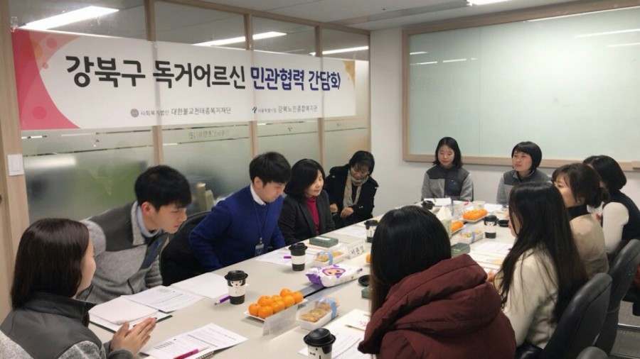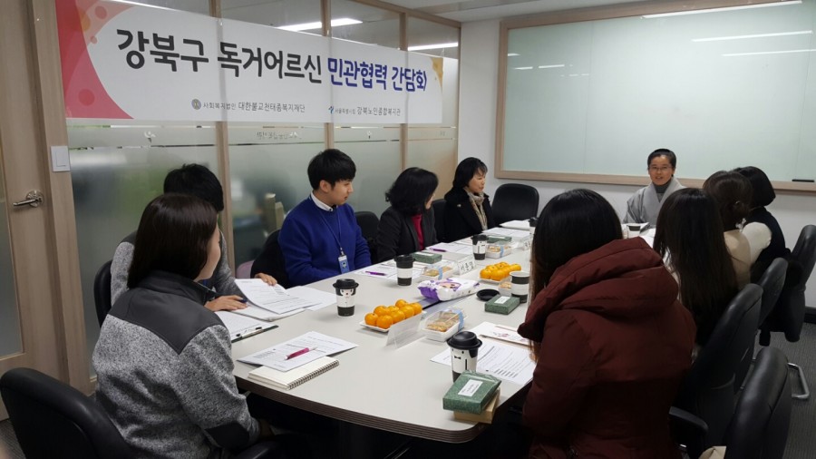 독거노인맞춤복지서비스사업에서는 노인돌봄기본서비스사업 안내 및 대상자 의뢰체계구축을 하고자 2016년 강북구 독거어르신 2차 민관협력 간담회를 진행하였습니다. 강북구청 주무관 및 강북구 내 독거어르신 관련 유관기관 실무자가 참석하여 기관별 사업에 대해 공유하는 시간을 가졌습니다.