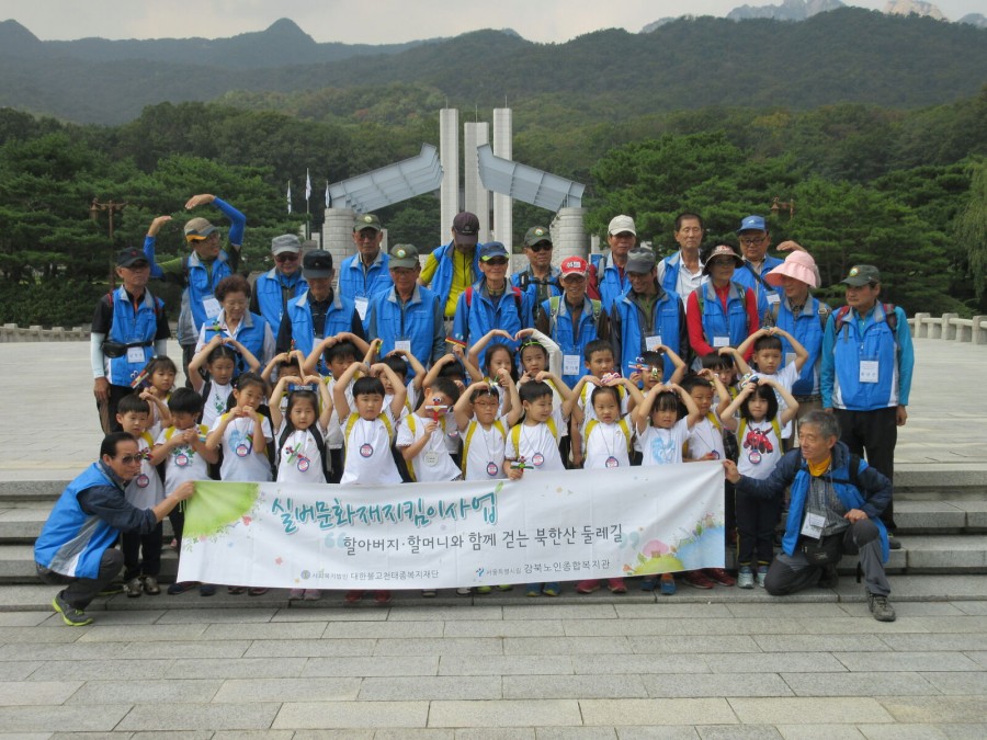 복지1과 실버문화재지킴이사업 1. 3세대 통합 프로그램  '할아버지. 할머니와 함께 걷는 북한산둘레길'   북한산들레길지킴이 어르신들과 예원유치원 대상으로 프로그램 진행하였습니다.  국립4.19민주묘지에서 기념답 참배, 4.19혁명기념관 관람, 잠자리 만들기 체험활동를 통해 1.3세대통합에 기여하는  기회를 가졌습니다.