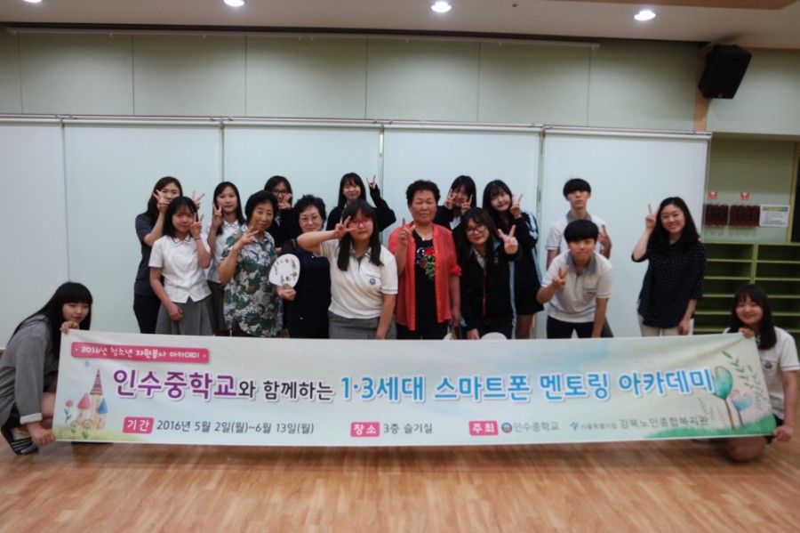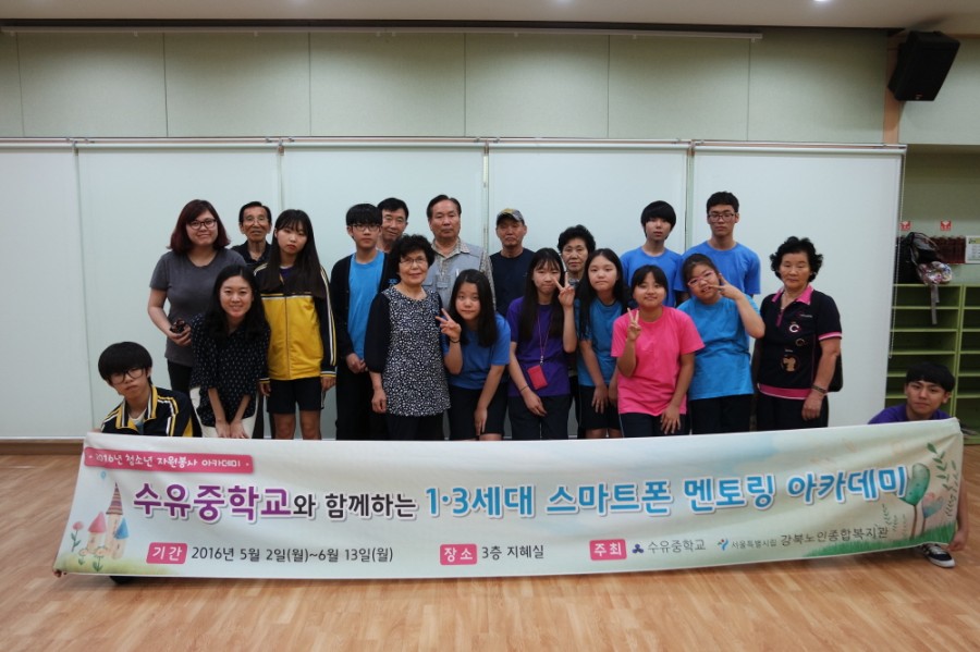 자원봉사자육성사업에서는 수유중학교 및 인수중학교의 지원으로 고령층의 정보격차를 해소하고 청소년의 건전한 자원봉사 문화를 활성화하고자 1*3세대 스마트폰 멘토링 아카데미를 진행하였습니다. 어르신과 청소년의 1:1 매칭을 통해 휴대폰 활용에 대한 맞춤형 교육을 진행함으로써 세대 간 이해와 통합을 도모할 수 있었던 시간이 되었습니다.