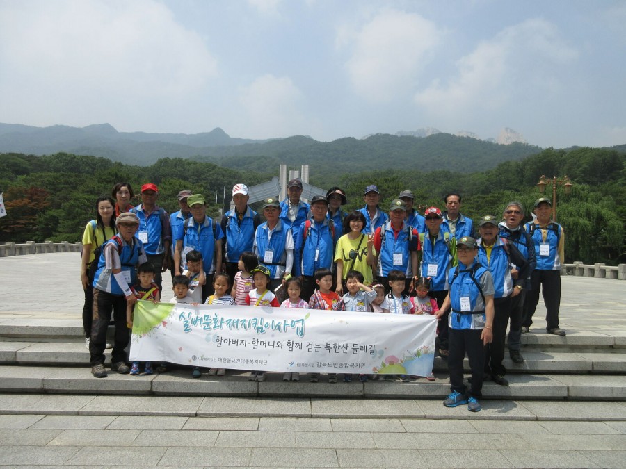 복지1과 실버문화재지킴이사업 1. 3세대 통합 프로그램 '할아버지. 할머니와 함께 걷는 북한산둘레길' 북한산들레길지킴이 어르신들과 강북구육아종합지원센터에서 연계하여 평강어린이집 대상으로 프로그램 진행하였습니다. 국립4.19민주묘지에서 참배, 4.19혁명기념관 관람, 풀잎손수건 만들기 체험활동를 통해 1.3세대 관계를 증진시키는 기회를 가졌습니다.