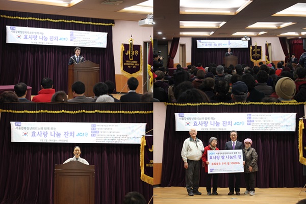 국민의례에 이어 강북JC 조진걸 회장의 축사를 시작으로 강북구청장과 김동식 구의장의 축사 소지 관장 스님의 격려사 진행되었고 독거어르신 100명을 대상으로 쌀전달식을 대표 2명에게 전달하는 시간도 있었습니다.