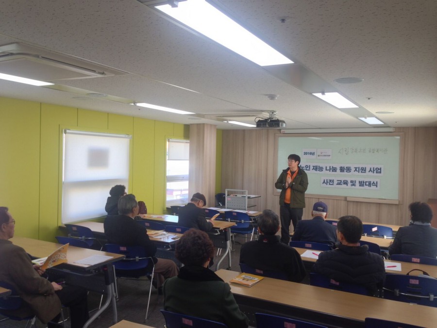 본 복지관 노인재능나눔활동지원사업에서는 2016년 노인재능나눔활동지원사업 참여 합격 어르신 10명을 모시고 재능나눔활동지원사업 사전교육 및 안전교육을 진행하였습니다. 어르신들이 활동 하시는데 어려움이 없을 수 있도록 지원하겠습니다.