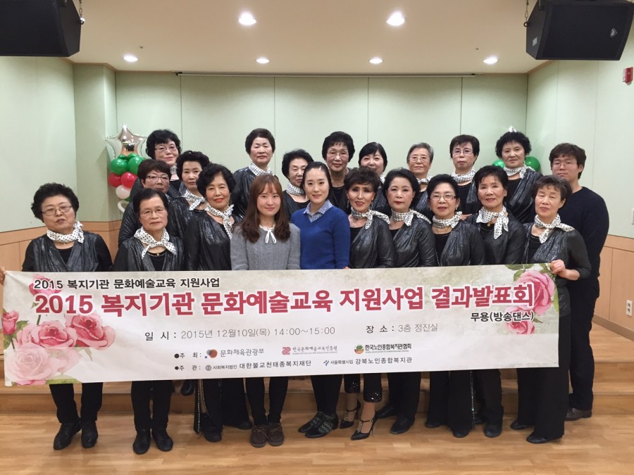 본 복지관에서는 문화체육관광부, 한국문화예술교육진흥원, 한국노인종합복지관협회가 주최하고 사회복지법인 대한불교천태종복지재단, 서울특별시립 강북노인종합복지관이 주관하는 문화예술교육 지원사업(방송댄스) 결과발표회를 진행하였습니다. 이번 발표회는 1년동안 배운 무용공연 뿐만 아니라 도봉노인종합복지관의 찬조출연을 통하여 더욱 풍성한 발표회가되었습니다. 이번 발표회를 통하여 어르신들의 자존감, 만족감이 향상되었습니다.