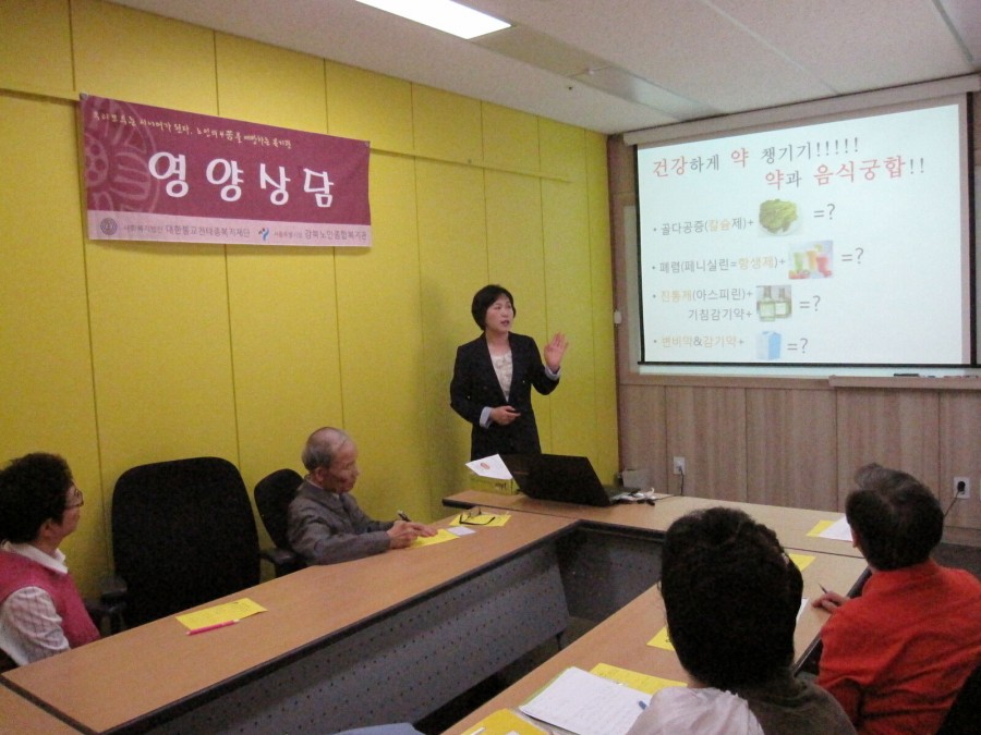 본 복지관 종합상담사업에서는 회원 어르신들을 대상으로 치매예방 식이요법에 대한 정보를 제공하기 위하여 복리후생팀 영양사와 연계하여 「15년 1차 영양상담」을 5월 22일(금)에 진행하였습니다.