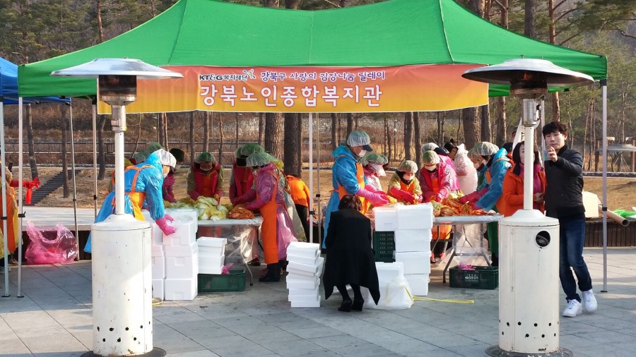 재가복지사업에서는 경제적 어려움을 호소하고 있는 재가대상자에게 김장을 제공함으로써 기본적인 식생활을 지원하고 영양결핍과 결식예방을 도모하고자 KT&G복지재단과 함께하는 2014 강북구 사랑의 김장나눔 릴레이 행사를 진행하고 대상자 200명에게 전달하였습니다.