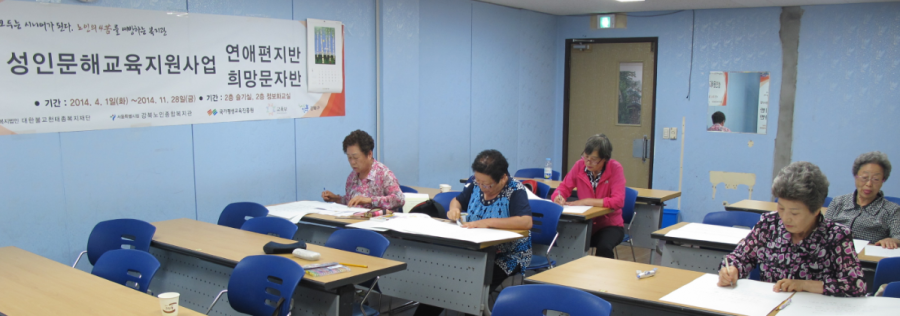 사회교육 사업에서는 성인문해교육 지원사업 수강생을 대상으로 시화전을 제작하였습니다. 희망문자반 15명, 연애편지반 15명. 총 30명이 참여하였으며, 이중 가장 뛰어난 작품 5작품을 선별하여 시화전으로 제작, 성인문해교육 거점기관인 마들여성학교에 제출하였습니다.