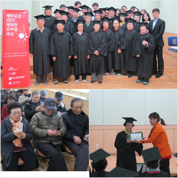 시립강북노인종합복지관 복지1과 사회교육팀에서는 2013년 SK Telecom 휴대폰활용교육 21기 참가 어르신 및 Sunny봉사단을 대상으로 졸업식을 진행하였습니다.