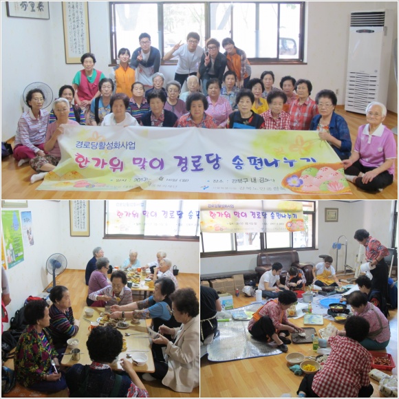시립강북노인종합복지관 경로당활성화사업에서는 한가위를 맞아 경로당어르신들과 함께 송편나누기를 진행하였습니다.