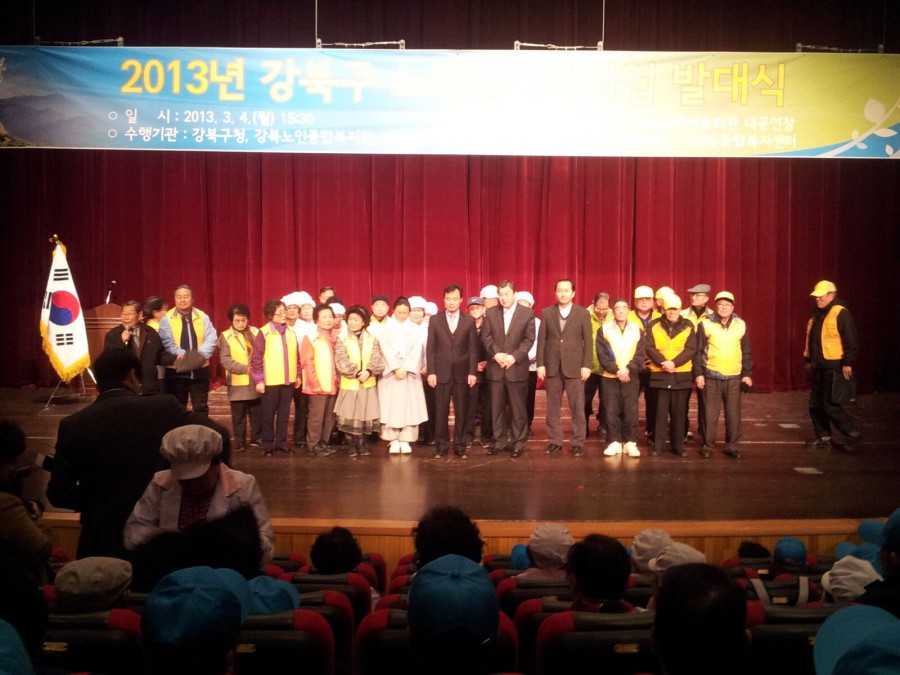 2013년 노인일자리사업을 진행함에 앞서 3월 4일 강북문화예술회관에서 노인일자리 발대식을 진행하하였습니다. 강북노인종합복지관에서는 230여명의 어르신이 참석하여 자리를 빛내 주셨습니다. 참여해 주신 모든 분들께 감사드립니다.