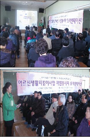 시립강북노인종합복지관 재가복지사업에서는 어르신생활지킴이사업에 참여하는 자원봉사자를 모시고 자원봉사자 오리엔테이션을 실시하였습니다. 총 100명의 자원봉사어르신이 참석하였으며, 재가복지사업 설명·자원봉사자 및 자원봉사활동에 관한 설명을 통해 어르신생활지킴이사업을 이해할 수 있는 뜻깊은 시간이 되었습니다.