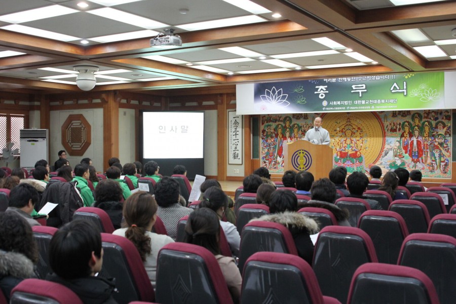 시립강북노인종합복지관에서는 법인 산하시설인 우면종합사회복지관, 송파노인전문요양원과 함께 관문사에서 "2012년 종무식"에 참석하였습니다.종무식에서는 우면종합사회복지관 윤금선 부장의 진행으로 "관문사 주지스님의 인사말"을 시작으로 종무사, 격려사, 직원표창, 2012년 활동상, 사진 촬영 등으로 행사가 진행되었습니다. 감사합니다▣ 일시 : 2012년 12월 31일(월), 16:00~17:30▣ 장소 : 관문사