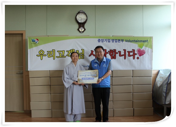 들을 모시고 후원물품 전달식과 자원봉사활동을 진행하였습니다. 이 날 후원해 주신 냉온찜