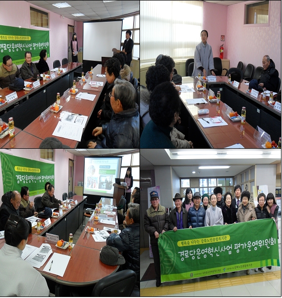 시립강북노인종합복지관 복지2과 경로당지원팀에서는 리더십사업으로 4분기 평가운영위원회가 진행되었습니다. 집중관리경로당 10개소 평가운영위원들을 모시고, 한 해 사업을 평가하는 시간을 가졌습니다. 이번 회의에는 관장님 인사말씀, 사업보고, 안건토의로 이루어졌습니다. 이번 평가회를 통해서 2011년을 점검하고, 2012년 계획을 세울 수 있는 기회가 되었습니다. 이번 행사에 참석해주신 평가운영위원들에게 감사드립니다.