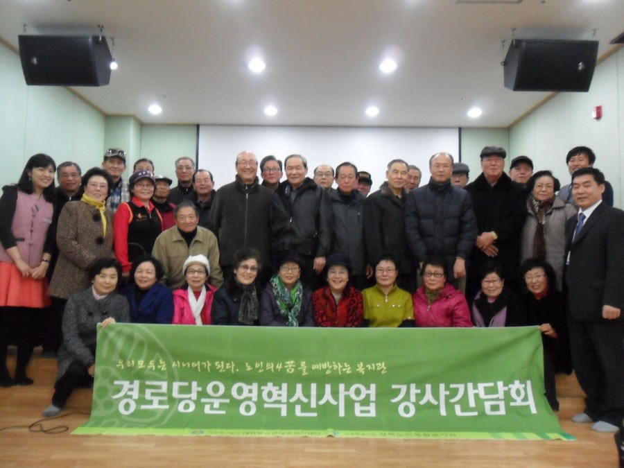 시립강북노인종합복지관 복지2과 경로당지원팀에서는 경로당으로 파견되고 있는 강사들을 모시고 하반기 간담회를 진행했습니다. 하반기 강사간담회를 통해서 2011년 파견강사 활동 소개, 활동점검 및 의견개진을 하는 시간을 갖았습니다. 이를 통해서 경로당 강사 파견사업과 관련하여 2012년 경로당 사업방향에 대해서 나눌 수 있는 좋은 시간이 되었습니다. 경로당 강사간담회에서 나온 의견을 반영하여 2012년에는 경로당 파견강사들이 더 나은 활동을 할 수 있도록 노력하겠습니다.