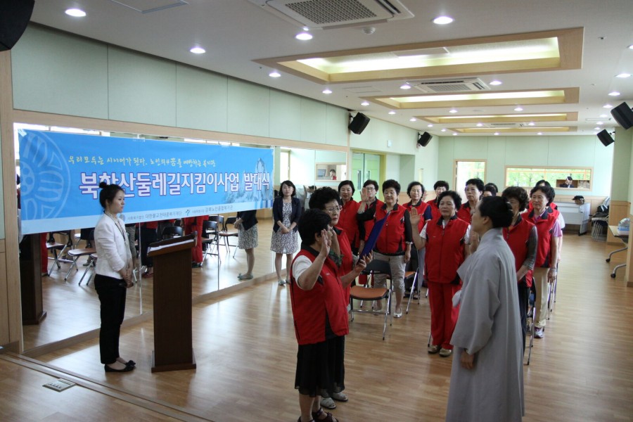 시립강북노인종합복지관에서는 특화사업의 일환으로 지역사회보존 및 1․3세대 통합 증진을 위한 북한산둘레길지킴이사업을 기획하였습니다. 북한산둘레길지킴이봉사단으로 총 15명이 선발되었으며, 이날 발대식을 통해 관장님 격려사, 봉사단 선언문 낭독, 인증서 수여, 사업안내 등 사업의 실시를 공식적으로 표명하는 뜻 깊은 자리였습니다.