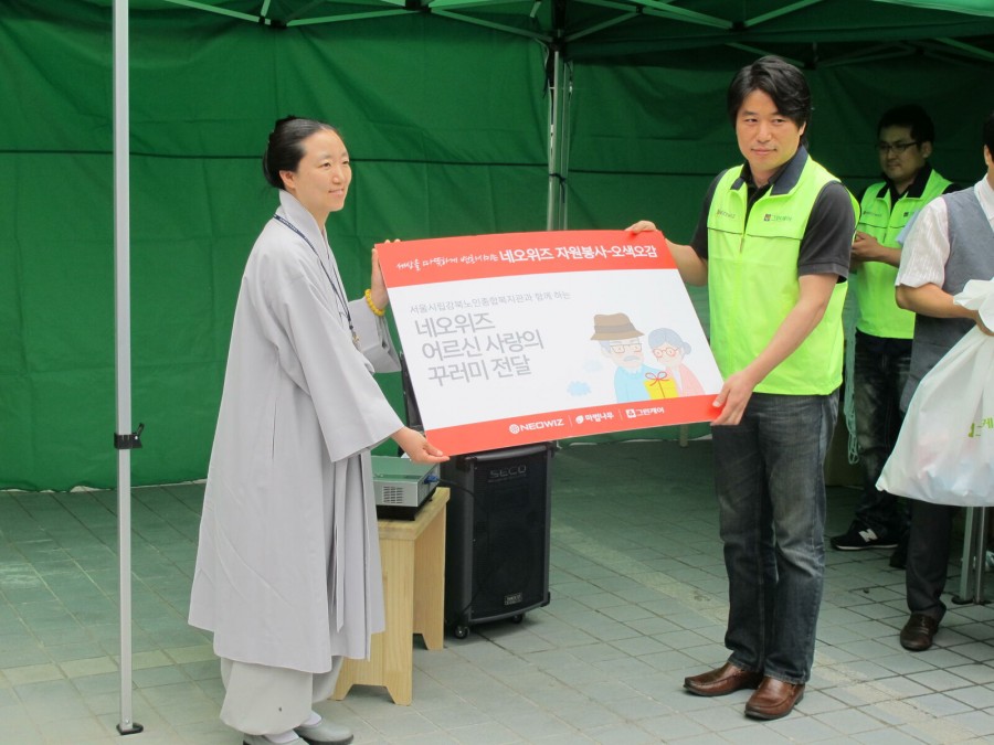 (주)네오위즈 그룹의 '오색오감' 봉사활동이 본 복지관에서 진행되었습니다. 지역 내 홀몸어르신들에게 전달할 다양한 품목의 후원물품을 전달하고 네오위즈 계열사 직원들이 직접 선물 꾸러미를 만들어 어르신들의 가정에 찾아가 전달하는 시간을 가졌습니다. 특히, 거동이 불편한 어르신들을 위해 지팡이와 안전손잡이를 지원하여 어르신들에게 빈번하게 발생할 수 있는 안전사고를 예방할 수 있게 되었습니다.