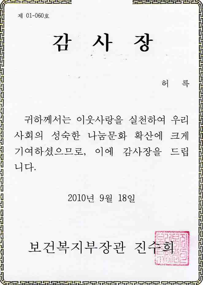 한국사회복지협의회에서 우수 자원봉사자로 선정된 허륵 자원봉사자는 이날 행사에서 이웃사랑을 실천하여 우리사회의 성숙한 나눔문화 확산에 기여한 공로로 감사장을 수여받았습니다.