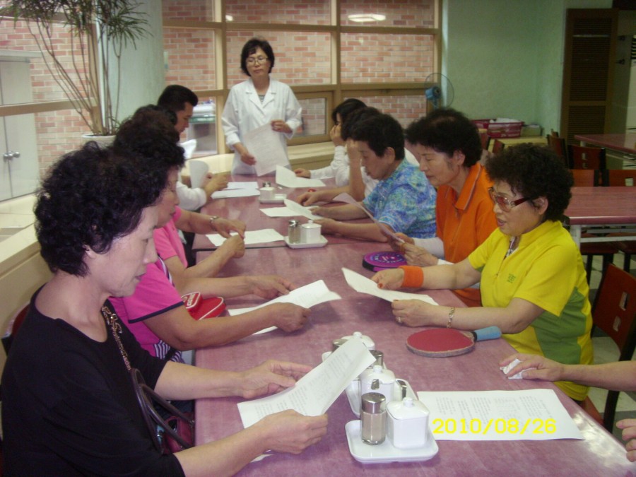 시립강북노인종합복지관은 안전하고 위생적인 급식소 운영을 통한 사고 및 질병예방을 위해 매월 영양사가 조리종사자와 자원봉사자들을 대상으로 위생교육을 실시하고 있습니다.