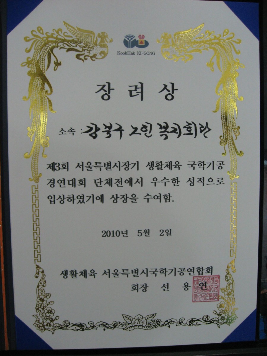 국민생활체육 서울시국학기공연합회에서 주관한 ‘제3회 서울특별시장기 국학기공경연대회'에 시립강북노인종합복지관 단전호흡반 홍차순 강사 외 회원 47명이 단체전에 참가하여 장려상을 수상하였습니다.