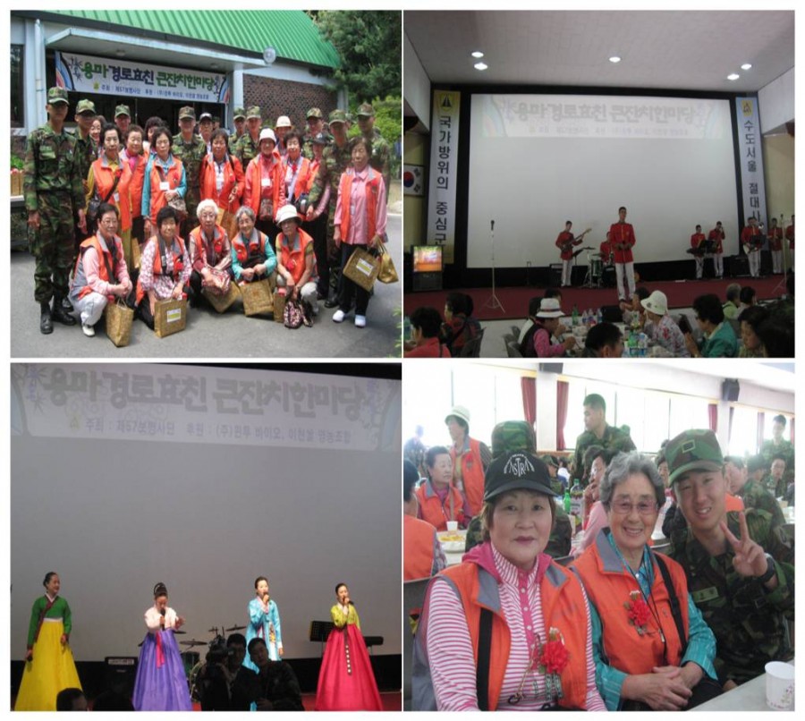 강북노인종합복지관에서는 노인돌봄기본서비스 수혜자분들을 보시고 제 57보병사단에서 진행하는 '용마 경로효친 큰잔치 한마당'에 다녀왔습니다. 멋지고 늠름한 장병 500여명과 함께 강북구를 비롯한 10개구 어르신 200여명이 참여해 즐겁고 흥겨운 시간을 보냈습니다. 행사를 준비해 주신 제 57보병사단 관계자 여러분께 다시한번 감사드립니다.