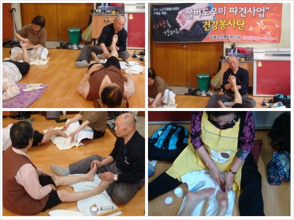 실버도우미 건강봉사단은 지난 3월 4일 장수경로당을 방문하여 경로당 이용어르신을 위한 발마사지를 진행하였습니다. 능숙한 솜씨로 발크림을 발라 마사지를 하고 피로를 풀 수 있도록 돕는 건강봉사단! 노년기 봉사활동으로 아름다운 생활을 가꾸어가시는 건강봉사단의 활약을 더욱 기대해봅니다.