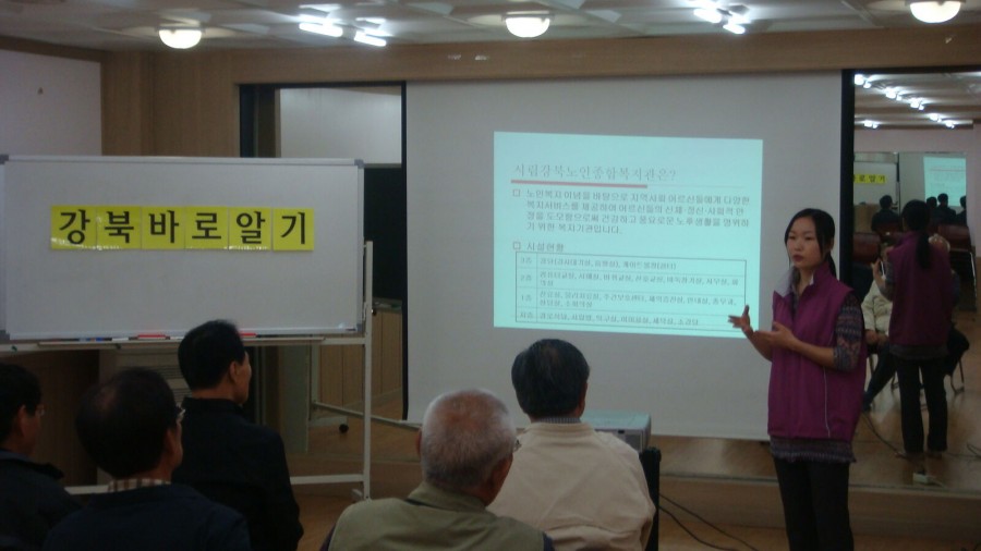 강북노인종합복지관에 새로 회원가입을 하신 어르신을 대상으로 매월 둘째주, 넷째주 목요일 오후3시에 신규회원 OT [강북바로알기]를 진행하고 있습니다. 새로운 가족을 환영하는 의미에서 자기소개를 통해 회원간 친목을 유도하고 복지관의 시설현황과 사업안내를 통해 복지관 이용에 편의를 도모하며 이용수칙을 안내하여 질서유지와 건강한 이용문화를 홍보하였습니다.