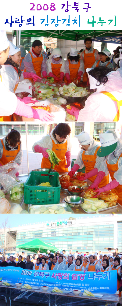이번 행사는 강북구 내 독거노인 및 저소득 가정 1,600세대에 지원될 김치를 버무리고 포장하는 일이 진행되었습니다.