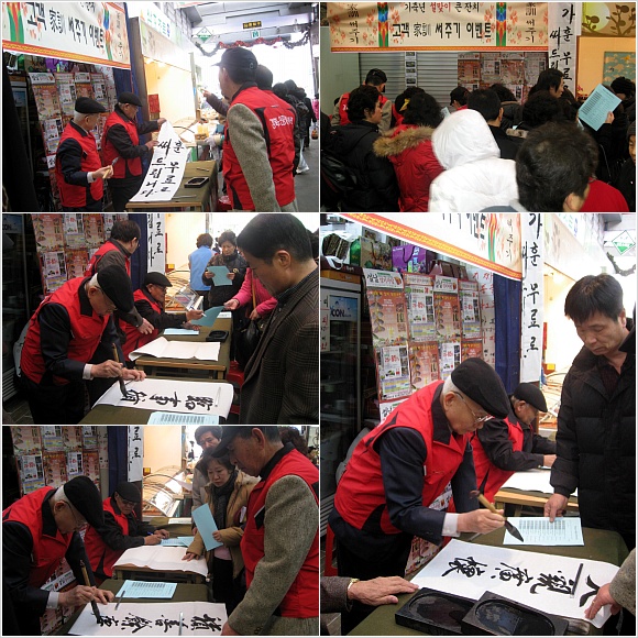 1월 22일 목요일 우리 복지관 서예반 어르신들께서 쌀쌀한 날씨속에 오후 2시부터 4시 30분까지 수유재래시장상인회에서 진행한 "기축년 설맞이 큰잔치"에 행사에 초청되어 지역주민 여러분께 가훈을 써드렸습니다.