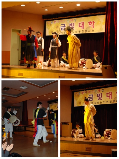 지난 3월13일 금요일 복지관 3층 강당에서는 호루라기연극단의 특별공연이 있었습니다. 영화배우 류수영씨의 사회로 트로트, 마당놀이 '봉이김선달'이 진행되었으며 무대 위에 함께 서진 않았지만 영화배우 조승우씨도 참석하여 많은 어르신들의 환호성과 인기를 실감할 수 있었습니다. 즐거운 음악과 연기, 분장으로 어르신들의 흥을 더한 서울시경찰청 호루라기연극단 관계자 여러분께 감사의 말씀을 전합니다.