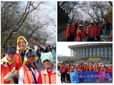 이날은 제5회 서울사회복지걷기대회가 있는 날이었는데요 금빛대학 어르신들을 모시고 봄 향기가 물씬나는 벛꽃나들이도 함께 햇습니다.
