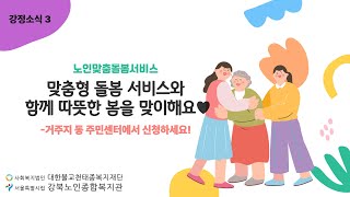 시니어지역종합상담사업에서는 어르신 및 지역주민에게 다양한 복지 정보를 전달하기 위해 강북복지정보소식(강정소식) 동영상을 준비하였습니다. 이번 시간에는 노인맞춤돌봄…