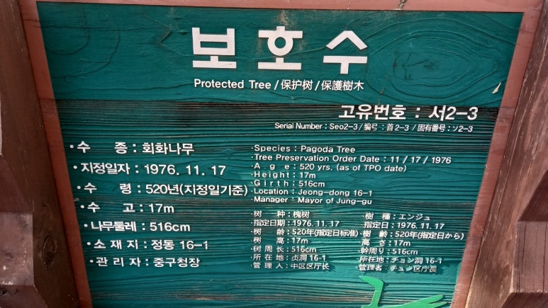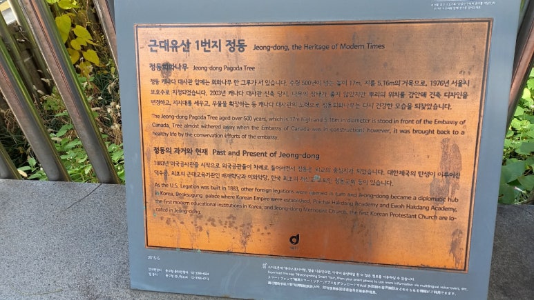 근대유산 1번지 정동에는 회화나무 1그루가 서있는데 수령 500 년이 넘는 높이 17m 지름 5.16m의