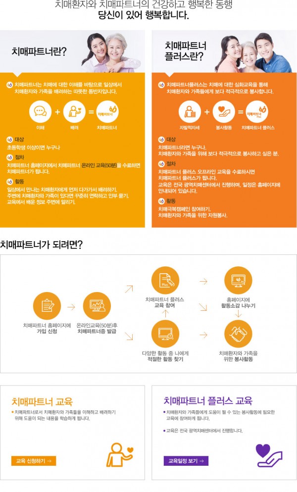 “치매파트너”란, 치매에 대한 이해를 바탕으로 일상에서 치매환자와 가족을 배려하는 따뜻한 동반자입니다.