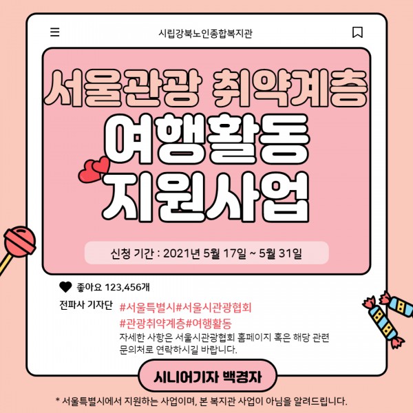 2021년 7월~9월 사이 서울특별시에서는 서울 관광취약계층을 대상으로 여행활동 지원사업을 펼친다.