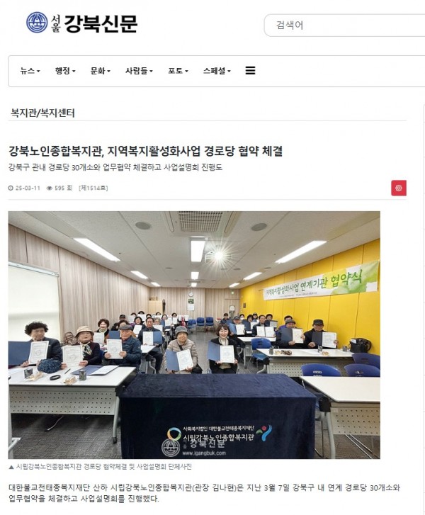 [2025.03.11] 강북노인종합복지관, 지역복지활성화사업 경로당 협약 체결 - 서울강북신문