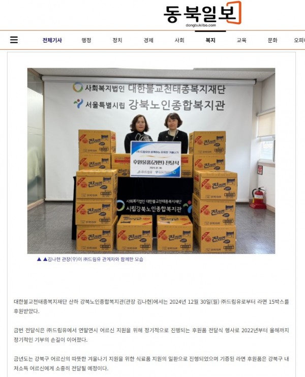 [2025.01.03]동북일보 _ ㈜드림유, 시립강북노인종합복지관 후원물품(라면) 전달-동북일보